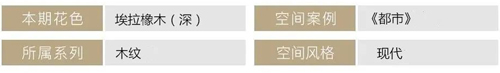 《都市》空間的主要花色為 埃拉橡木(深),中性色調的木材應用讓空間更有質感,搭配清淡的色彩和石紋讓整個空間顯得理性,不需要多余繁奢的飾品裝飾,幾幅個性掛畫,中規中矩的燈飾,就呈現出一種都市人時尚簡約的生活方式。
