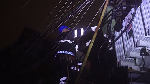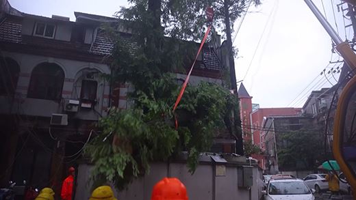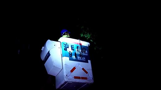 在暴雨中,搶險人員在市民的指點下,很快找到故障點,原來是大樹枝丫在狂風中碰觸到了徽寧路8a桿上的桿刀避雷器,引發了出火和開關跳閘。在評估了現場環境和搶修條件,因為風雨無法進行帶電作業,因此通過調整配網運行方式,并用絕緣斗臂車升上高空修剪周邊樹枝,確保不再發生異物碰觸。在確認電力設備正常運行后,于23點30分左右恢復送電。
