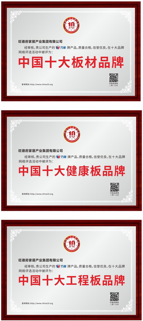 權(quán)威媒體《中國品牌網(wǎng)》一直對家居建材行業(yè)的發(fā)展尤為關(guān)注,特意聯(lián)合十余家主流媒體共同舉辦了“中國十大品牌”評選活動,邀請行業(yè)專家和全國消費者參與審核和投票,在板材圈引起了強烈反響。旺德府家居產(chǎn)業(yè)集團旗下主營品牌“萬象”,亦憑借雄厚的資質(zhì)順利獲得參選資格。其在一路的選拔賽中名列前茅,最終斬獲了“中國十大板材品牌”、“中國十大健康板品牌”、“中國十大工程板材品牌”三項榮譽稱號,在多位贏家之中顯得更加閃耀。