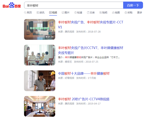 在閱讀過文字版的報(bào)道后,我們不妨再通過視頻版展示來進(jìn)一步了解豐葉板材。在視頻板塊的搜索結(jié)果中,我們看到了愛奇藝、優(yōu)酷、騰訊視頻、好看視頻等數(shù)十家人氣視頻網(wǎng)站的熟悉身影,可見豐葉板材已與這些流量型平臺達(dá)成了戰(zhàn)略合作,以視聽結(jié)合的方式為自身的品牌廣告片推廣奠定下高覆蓋性傳播的基礎(chǔ)。