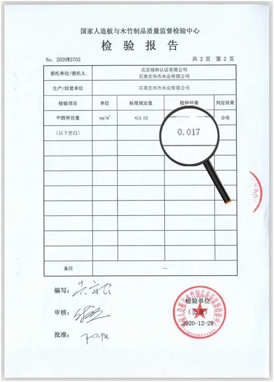 早在今年1月初,華杰板材就通過了由中國林產工業協會制定的團體標準《無醛人造板及其制品》無醛級的質量要求≤0.03mg/m³,經檢驗中心檢測,華杰板材基材甲醛釋放量低至0.017mg/m³,獲得無醛認證證書。
