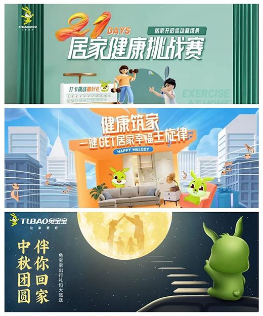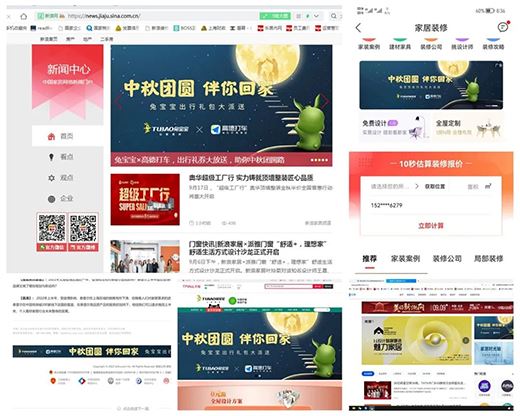 中秋期間,配合“中秋團圓 伴你回家”聯(lián)名推廣活動,兔寶寶在搜狐、天貓、騰訊、新浪、房天下等多個媒體平臺上線活動優(yōu)惠畫面,多平臺搶占流量高地,進一步擴大兔寶寶中秋活動曝光量,輻射多層次及年齡段用戶,全方位提升兔寶寶品牌影響力及品牌高度。