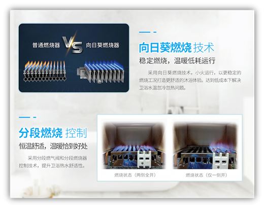 格瑞泰DE系列燃氣壁掛爐搭載了向日葵燃燒器,采用智能分段燃燒控制技術,壁掛爐調溫速度更快,控溫范圍更廣,針對不同使用場景,燃燒器可自動調整燃燒火排數量,出水溫度可以精確至±1℃,有效解決一年四季溫差變化導致的出水溫度忽冷忽熱的問題,沐浴用水的體驗得到了大幅提升。智能分段燃燒同樣有效降低壁掛爐頻繁啟停導致的熱效率損失,提升了采暖爐的使用壽命。