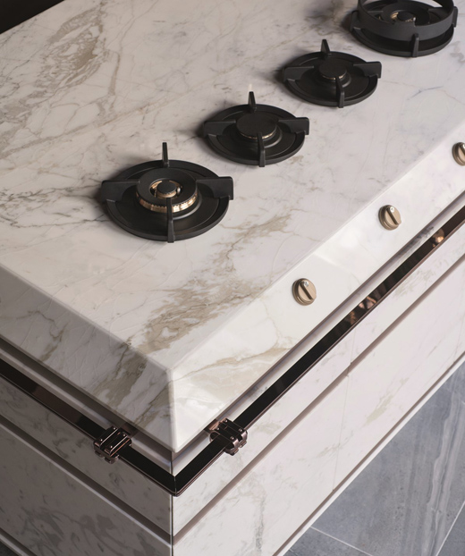 大理石外觀(用于櫥柜工作臺、門以及踢腳板)與廚房整體的設計完美結合在一起,工作臺面的傾斜設計、踢腳板以及無把手門使這種設計感更加強烈。