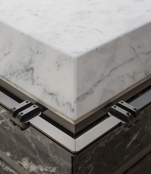 Calacatta Oro大理石與青銅涂層的組合、Grigio Carnico、Statuario大理石和金屬槍飾面的組合均是可選項。
