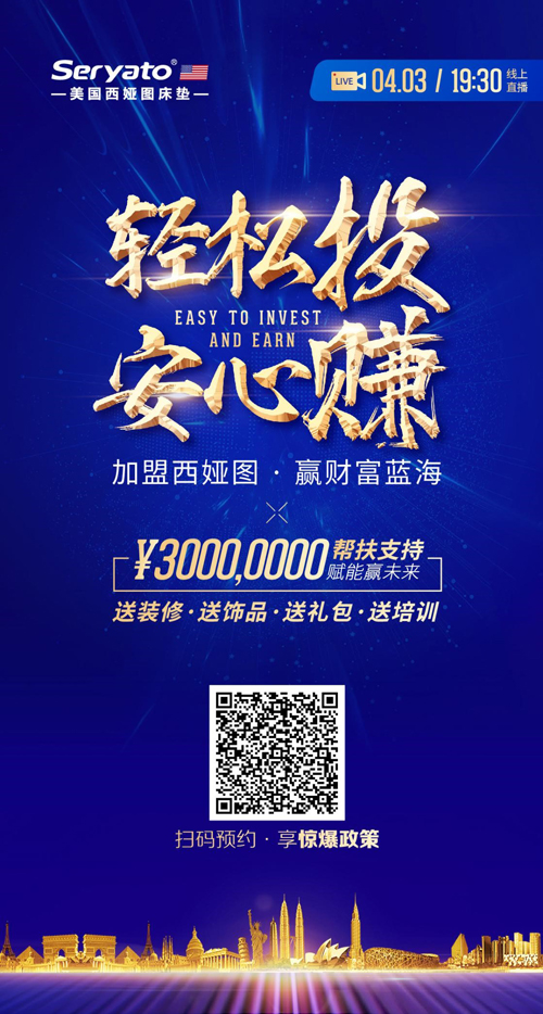4月3日晚19:30西婭圖將面向全球舉辦“輕松投,安心賺”線上直播招商會(huì),計(jì)劃新招募50家有夢(mèng)想、有格局、敢打敢拼的新晉經(jīng)銷商,重點(diǎn)幫扶、重點(diǎn)支持、做強(qiáng)再做大!