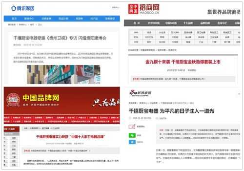 《新浪家居》、《網(wǎng)易家居》、《搜狐網(wǎng)》、《騰訊家居》、《中國品牌網(wǎng)》、《中國品牌招商網(wǎng)》、《中國建材家居網(wǎng)》等數(shù)百家網(wǎng)站對千禧廚寶電器進(jìn)行全年跟蹤報(bào)道,堅(jiān)持將品牌的第一手資訊帶給經(jīng)銷商與消費(fèi)者。