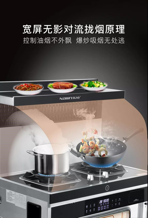 樂鈴多功能一體集成灶在煙機、灶具上的性能表現(xiàn)向來出色。21m³/min增壓大吸力、5.0kW猛火滿足任何類型的爆炒。此外,樂鈴多功能一體集成灶在煙機上還作了進一步升級,利用寬屏無影對流攏煙原理,控制油煙不外飄,爆炒吸煙無處逃。