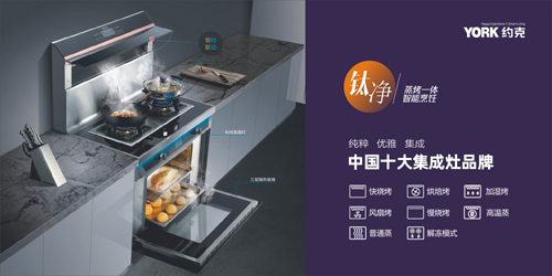 YORK約克智能蒸烤一體集成灶YK-J9ZK,是一款集燃氣灶、吸油煙機、蒸箱、烤箱等電器組合而成的多功能廚電,安裝后占地約1平方米,可節省許多空間;其304不銹鋼一體機身灶面,容易清潔又顯高檔雅致,適用于大部分的家居裝修風格。