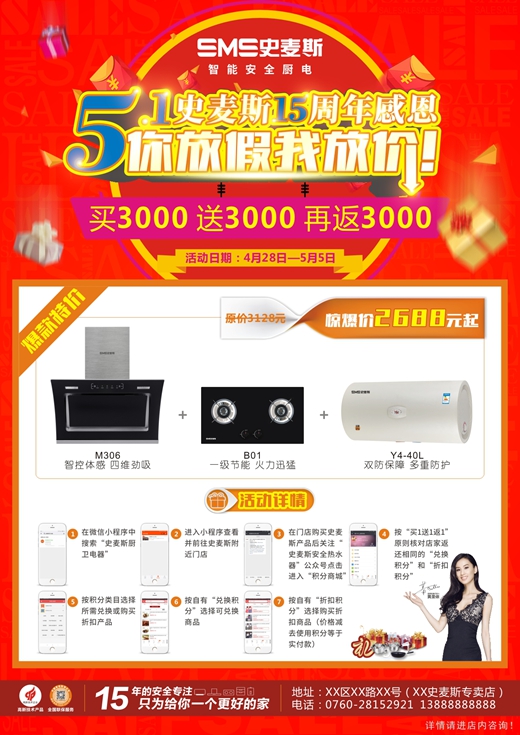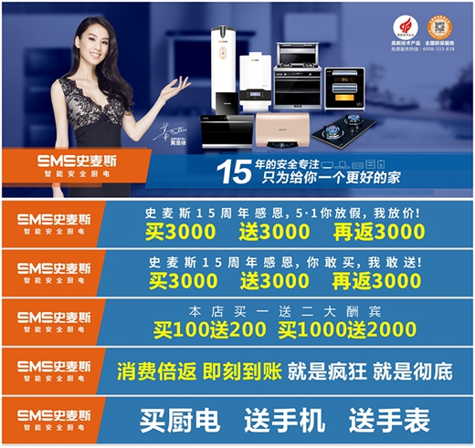 4月28日-5月5日,史麥斯廚衛(wèi)電器將隆重拉開15周年感恩活動的序幕,并接連發(fā)出“買3000送3000,再返3000”、“你放假,我放價;你敢買,我敢送”的霸氣宣言。