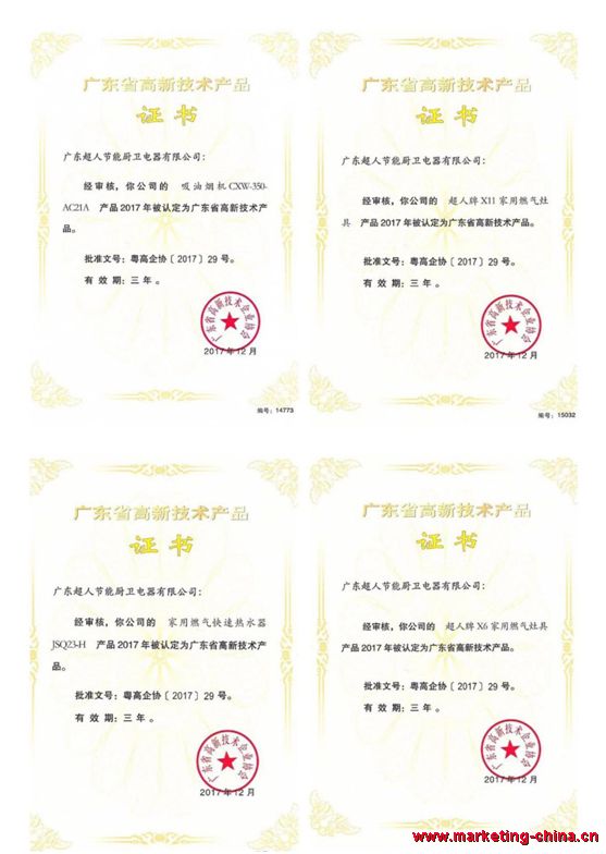 玩火也要玩出格局。2017年12月,超人系列CXW-350-AC21A煙機、X11家用燃氣灶、X6家用燃氣灶、JSQ23-H家用燃氣快速熱水器四款產品被認定為廣東省高新技術產品。