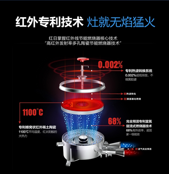 此外,紅日廚衛(wèi)紅外線集成灶采用紅外發(fā)熱技術(shù),熱效率可高達(dá)68%,遠(yuǎn)超傳統(tǒng)燃?xì)庠顕?guó)家標(biāo)準(zhǔn),有毒氣體排放幾乎為零,在火力更猛的同時(shí),還在最大程度上節(jié)約了能源,三大高效節(jié)能核心專(zhuān)利技術(shù),造就無(wú)焰猛火。