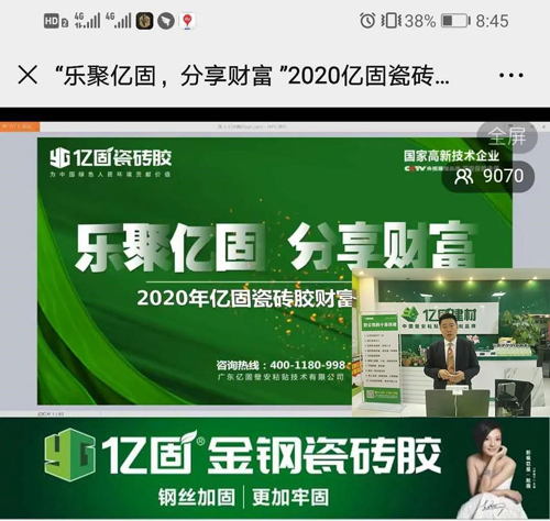 2020年3月28日19:30—21:00,億固瓷磚膠成功舉行了以主題為“樂聚億固,分享財富”的線上直播財富分享會。好品牌、好項目、好政策,短短90分鐘成功吸引了全國9000多名建材精英們參與,32名客戶達成合作意向。