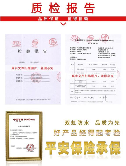 享有“中國十大防水材料品牌”之美譽的雙虹品牌,每每出品都有質量保障、十分講究耐用。其防輻射隔熱涂料,具備強悍的粘結能力,即使長期處于暴雨、暴曬環境,也絲毫不會產生起皮脫落現象;還有超強的耐候性能支持應用于普通屋頂、彩鋼瓦、琉璃瓦、鐵皮房、外墻、工廠區等,加大應用普及范圍,惠及全民生活和生產商業環境。值得一提的是,雙虹防水材料品牌旗下的所有產品系列,已與世界500強之一平安保險公司簽訂投保協議,為產品質量和售后服務打上了一層更堅實的“堡壘”,鄭重承諾保障用戶的消費權益。