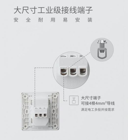 優質的PC材質阻燃不變形,還具備抗老化、氧化的特點,能保證產品使用多年依然如新。框架底座一體化成型結構更穩定、不易變形,接線端子的超大接線空間設計,可同時容納4根4m㎡導線,滿足家庭多電器大用電量的需求。