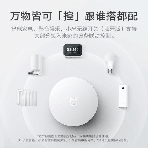 小米無線開關(guān)藍(lán)牙版開啟預(yù)售,價格39元,前100名評價曬單送2000京豆。這是一款智能無線開關(guān)按鈕,配合藍(lán)牙網(wǎng)關(guān)和智能設(shè)備,可以控制家電開啟和關(guān)閉。