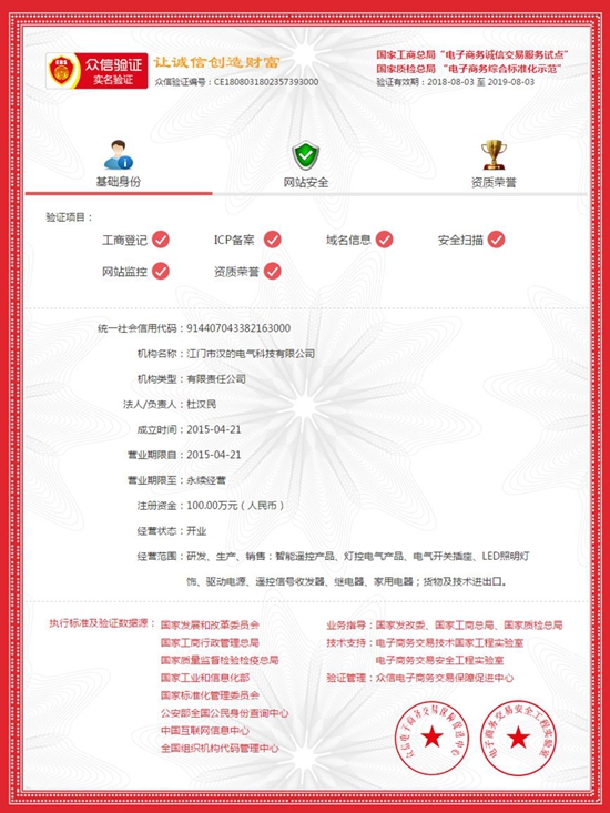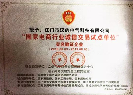 2018年8月3日,眾信電子商務交易保障促進中心依據發改委、工信部、商務部和國資委法規政策指導,授予江門市漢的電氣有限公司“國家電商行業誠信交易試點單位”。