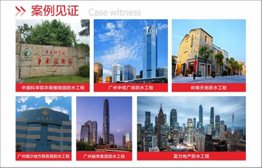 邦佳防水擁有豐富的防水工程成功案例,如:中國科學(xué)院華南植物園防水工程、廣州中信廣場、嶺南天地防水工程、廣州南沙地方稅務(wù)局防水工程……在臺風(fēng)肆虐的季節(jié),邦佳防水所做的工程均未出現(xiàn)任何質(zhì)量問題,更做到了客戶0投訴,工程質(zhì)量值得信賴。