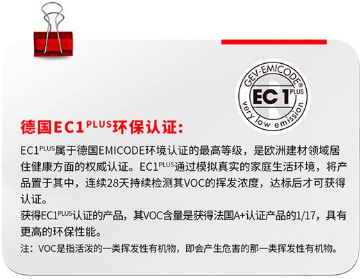 同時,通過德國嚴苛的EC1plus環保檢測,法國室內環境檢測A+級標準,綠色十環環境認證,工人使用放心,業主居住安心。