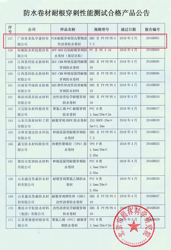 2018年5月4日,北京園林科學研究院官方網站發布了《防水卷材耐根穿刺性能測試合格產品最新公告》,廣西青龍化學建材有限公司等17家防水企業生產的23款防水卷材通過耐根穿刺性能專項測試。青龍耐根穿刺型防水卷材測試的順利通過,將可以為種植屋面客戶提供全面的安全、防水保障。