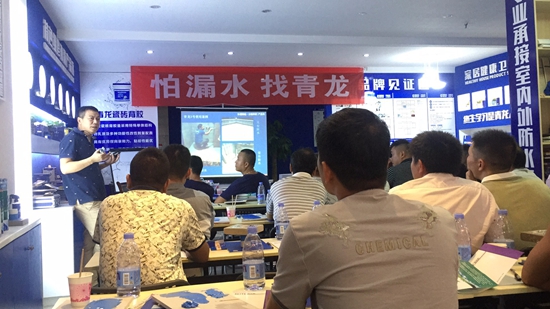 培訓會上,宋董事長為大家深入分析家裝防水行業走勢和青龍特色堵漏新品,指出2018年很多防水廠家都在布局堵漏市場,對防水創業者而言,現在正是契入建筑堵漏市場的最好時機,先進入者也將獲得更多優勢。然后對青龍全能防水膠、青龍3號、砼1號、砼2號等特色維修補漏產品進行了更為詳細的講解,拓展了大家建筑修繕視野,也提高了對舊房維修補漏技術和自信心。