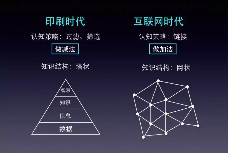 這時,大腦認知世界的基本策略是過濾、篩選,即通過“做減法”來獲取知識。知識的形狀呈“數(shù)據(jù)-信息-知識-智慧”的金字塔形狀。互聯(lián)網(wǎng)時代,情形改變了,電腦儲存信息既海量又廉價,大腦認知策略變?yōu)閷χR的鏈接,人們通過“做加法”來獲取知識,知識的形狀呈蜘蛛網(wǎng)狀。