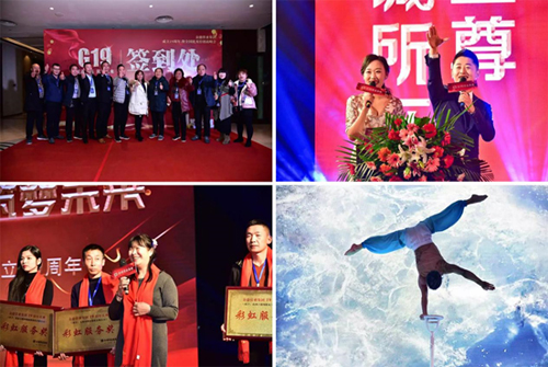 在盡情享受榮耀的高光時刻過后,各會場還準備了精彩紛呈的節目表演。現場掌聲雷動,熱鬧非凡,表演者柔美的舞姿,美妙的歌喉,高難度的雜技動作,精彩的二人轉表演,神奇的魔術……將宴會再一次推向高潮。家人們情不自禁的起立,想要找尋更好的角度觀看、拍攝表演實況,定格這精彩的瞬間。