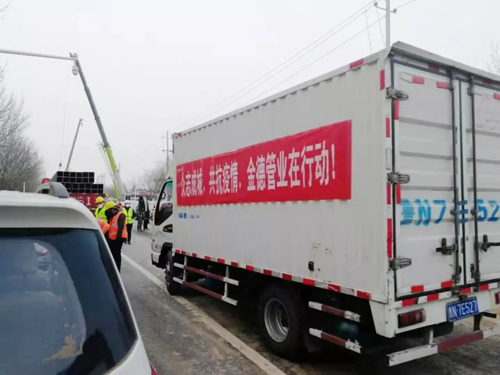 1月28日晚9點,金德管業對河南鄭州“小湯山”醫院援助計劃正式展開。金德管業山東工業園總經理楊洋和相關負責人放棄休假,帶領各部門員工連夜安排援助物資裝車。