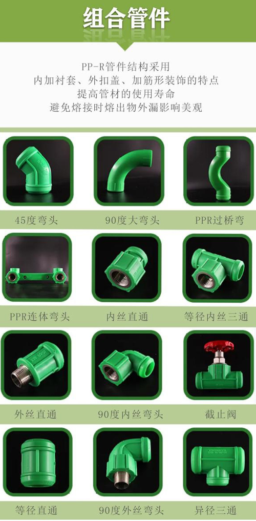 PP-R管件結(jié)構(gòu)采用內(nèi)加襯套、外扣蓋、加強(qiáng)筋形裝飾的特點(diǎn),提高管材的使用壽命,避免熔接時(shí)熔出物外漏影響美觀。