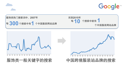 以服裝行業搜索行為變化為例。服飾類一般關鍵字的搜索基本比較平穩,主要是季節性的波動。而品牌關鍵字的搜索卻直線上升。2007年服裝類的熱門搜索詞中,每300個搜索中會有1個中國服裝的網站,而到了2015年,每10個搜索就有1個中國服裝網站品牌。