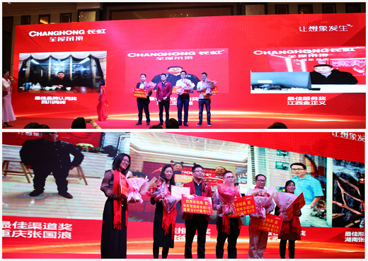 高峰論壇·頒獎盛典在夜晚正式拉開帷幕。落地實戰經驗的分享,讓在場嘉賓都聽得津津有味,沉浸在“干貨”的海洋里,愉悅暢游。同時,盛典還設立了頒獎環節,長虹全屋吊頂總部給在2017年有突出表現的優秀經銷商頒發獎項,以示嘉獎。獲獎者紛紛表示,在新的一年里要全力以赴,創造更大的價值,明年臺上的獲獎者,一定還有自己!