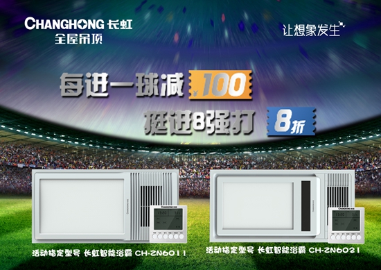 長(zhǎng)虹全屋吊頂事業(yè)部積極響應(yīng)總部支持比利時(shí)國(guó)家隊(duì)的號(hào)召,強(qiáng)勢(shì)發(fā)出“每進(jìn)一球減100 ,挺進(jìn)八強(qiáng)打8折”的宣言!在世界杯期間,只要比利時(shí)隊(duì)進(jìn)球越多,消費(fèi)者在購(gòu)買(mǎi)長(zhǎng)虹產(chǎn)品時(shí)優(yōu)惠就越多!