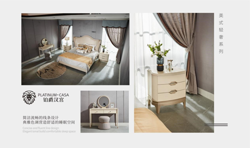 鉑爵漢宮家具設計源于美國輕奢藝術應用。它現代設計的靈感來源于美國特別受歡迎的“裝飾設計”,從產品設計到空間呈現遵循美國本土元素,簡潔優雅,風格純粹而明顯,主張用線條、色彩、裝飾打造輕奢空間。