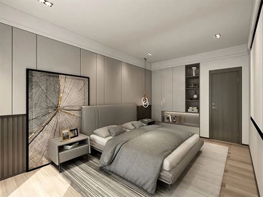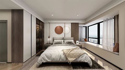 147㎡三房里的次臥接近主臥空間面積。沉穩內斂的色調和簡約風格都很適合父母居住。二三線城市住宅比起一線城市,空間上的優越感顯而易見。