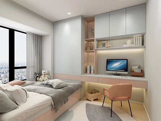 嵌入式衣柜和書柜,將家具與墻面融合為一體,平整統一,兼具美觀與實用。安裝了投影設備的次臥,娛樂追劇都能輕松駕馭。