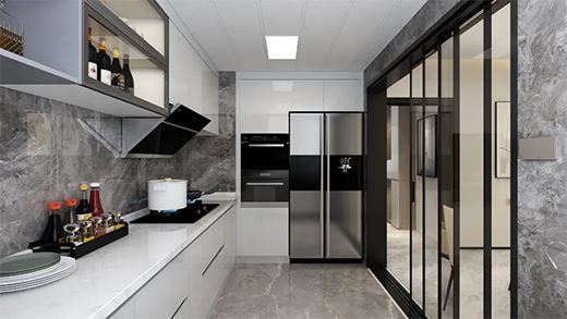 冰箱和消毒柜做嵌入式設計更顯美觀,飾以黑框和線條空間方正平整,簡約大方。