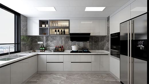 白亮光櫥柜搭配大理石紋臺面和墻面,耐臟又方便清潔,還給人以干凈整潔的感覺。