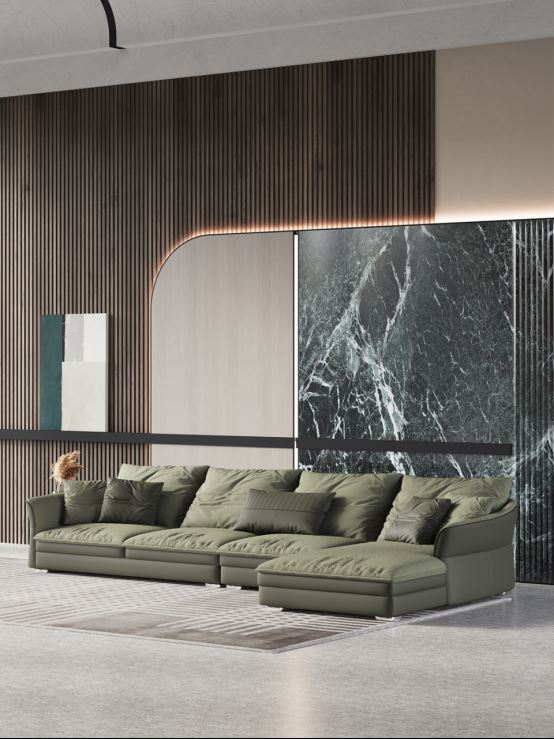 作為百搭色系中的一員,垂柳綠適合在高大宏偉的空間中使用,它低調柔和的色彩為挑高的空間營造出溫暖清新的氛圍,還能帶來賞心悅目的感覺,富有治愈氣息。洛品有家強調以純粹的材質體現品味,大面積的木飾面為整個空間帶來溫潤的視覺體驗,配合深邃優雅的垂柳綠沙發,讓靜謐在空間中繾綣雋永。