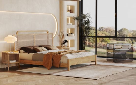 藤木工藝結合的極簡大床滿載著溫柔與舒適,將時尚與古典兼容,散發(fā)著純天然植物特有的光澤,為家居生活平添了幾分淡泊和從容。