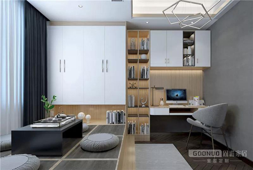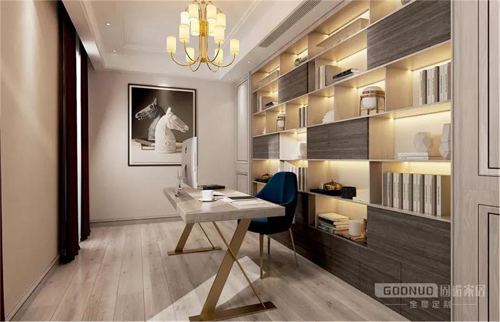 以書桌為中心進行書房的布局設計,合理的使用色彩搭配、選擇裝飾風格,讓閱讀和工作更舒適也更省空間。