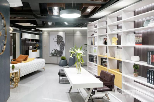 它打破傳統的空間使用慣例,把客廳當做開放式的書房,讓人一進門就可以看到,這樣的空間設計似乎勝過一間獨立的書房設計,把客廳區整面設置成一個大大的書柜,既是裝飾背景墻又是個很好的收納柜子。