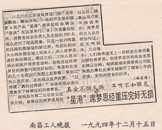 1992-1999年,星港相繼在湖南長沙等多個省市及地區(qū)開展“床墊現(xiàn)場碾壓”展示活動。