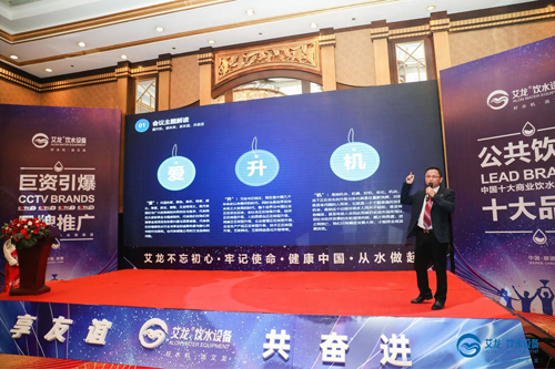 大會上,艾龍總經理傅永旺先生率先登臺,代表艾龍全體人員再次向應邀前來的經銷商家人們致以崇高的敬意。隨后,傅總圍繞“商用凈飲水行業(yè)獨家市場解讀”、“多維度戰(zhàn)略布局”、“經銷商經營謀略與贏利策略”三大核心主題進行重要講話。