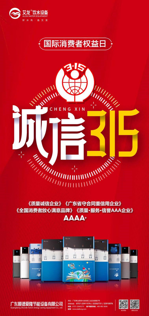 真金不怕火煉,艾龍充分認識到誠信經營的重要性,用心守護人們的飲水健康。成立于2006年的廣東順德愛隆節能設備有限公司始終秉承“誠則通、信而立、精達成、熟能巧”的獨特企業精神,將誠信經營貫穿于技術研發、產品制造、市場銷售、售后服務等企業生產與經營環節中,用品質和服務贏得了口碑和信譽。艾龍飲水設備已經走進千萬中國家庭、廣大集體和公共生場所、辦公區等場所,受到業界的肯定和消費者的青睞。
