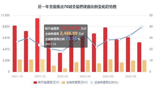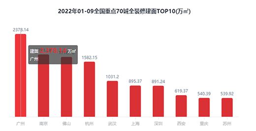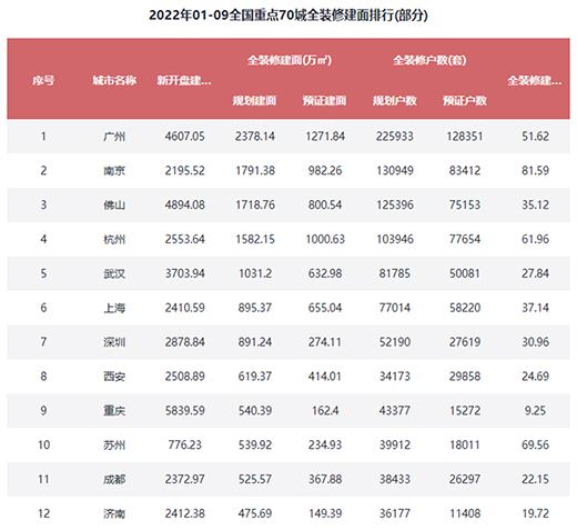 據統計,2022年1-9月全國重點70城新開盤建筑面積59189.61萬㎡,全裝修建筑面積16570.23萬㎡,同比減少20.25%;全裝修建筑戶數126.77萬套,同比減少90.2%;全裝修建面比例為28%。其中,全裝修建面排在前3位的城市分別為廣州2378.14萬㎡、南京1791.38萬㎡、佛山1718.76萬㎡;全裝修建面比例排在前3位的城市分別為昆山94.63%、南京81.59%、廈門77.35%。