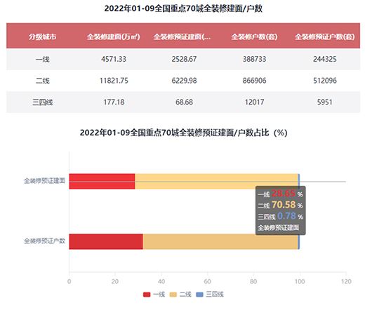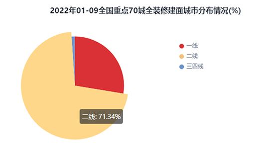 在全國重點70城全裝修建面規模方面,2022年1-9月全裝修建面TOP10城市有7席是二線城市,其中排在前三位的城市分別是廣州2378.14萬㎡、南京1791.38萬㎡和佛山1718.76萬㎡。對比全裝修建面在各分級城市的分布來看,二線城市全裝修建面為11821.75萬㎡,以71.34%占比居首位;一線城市全裝修建面為4571.33萬㎡,占比為27.59%次之;三四線城市全裝修建面177.18萬㎡,占比僅為1.07%最少。