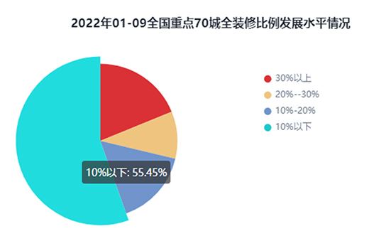 綜上,2022年1-9月全國重點70城全裝修項目規劃建面為16570.26萬㎡,全裝修預證建面8827.29萬㎡,預證建面占比37.23%。此外,全裝修比例TOP10城市有7席是二線城市,全裝修比例達到30%的城市占比為19%,未達到30%的城市占比為81%。