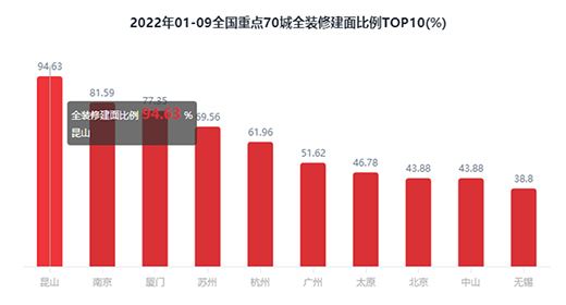 在全國重點70城全裝修建面比例方面,2022年1-9月全裝修比例TOP10城市有7席是二線城市,其中排在前3位的城市分別是昆山94.63%、南京81.59%、廈門77.35%。