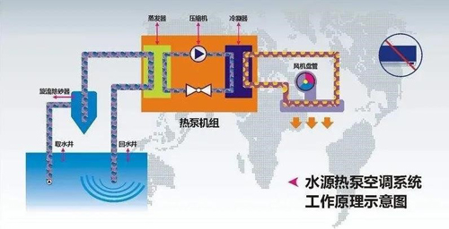 水源熱泵是一種清潔、高效、節能、環保、可再生的新能源技術,利用地球表面或淺層水源,以及人工再生水源的低位熱能,采用熱泵原理,通過消耗少量的電能,實現低位熱能向高位熱能轉移的一種技術。冬季,把存儲在水體中的熱量“取”出來,轉換后供給室內采暖;夏天,把室內的熱量釋放到水體中達到室內制冷的目的。