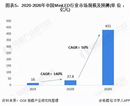 而中國(guó)作為全球電子最具有發(fā)展?jié)摿Φ膰?guó)家之一,在電視、顯示器、可穿戴設(shè)備、車(chē)載顯示等終端需求旺盛的驅(qū)動(dòng)下,Mini LED有望在未來(lái)幾年迎來(lái)快速增長(zhǎng)期。前瞻產(chǎn)業(yè)研究院的數(shù)據(jù)顯示,2020年中國(guó)Mini LED市場(chǎng)規(guī)模在37.8億元左右,同比增幅高達(dá)140%,預(yù)計(jì)2026年中國(guó)Mini LED行業(yè)市場(chǎng)規(guī)模有望突破400億元,以此計(jì)算,未來(lái)六年復(fù)合增速達(dá)到145.7%。